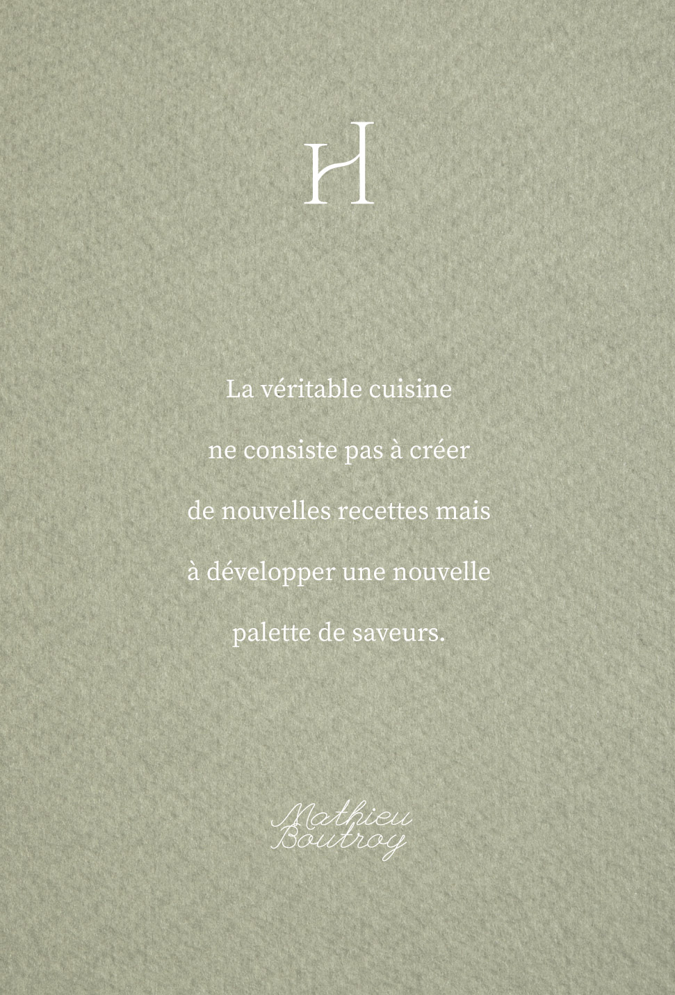 Ce travail graphique s’inscrit dans la continuité du travail de Mathieu Boutroy, pour qui l’ouverture de ce restaurant représente l’aboutissement d’un rêve et d’un engagement personnel fort. Sa cuisine, construite au fil des années d’expérience et nourrie par une exigence constante, méritait une identité à son image : authentique, sensible et profondément humaine.