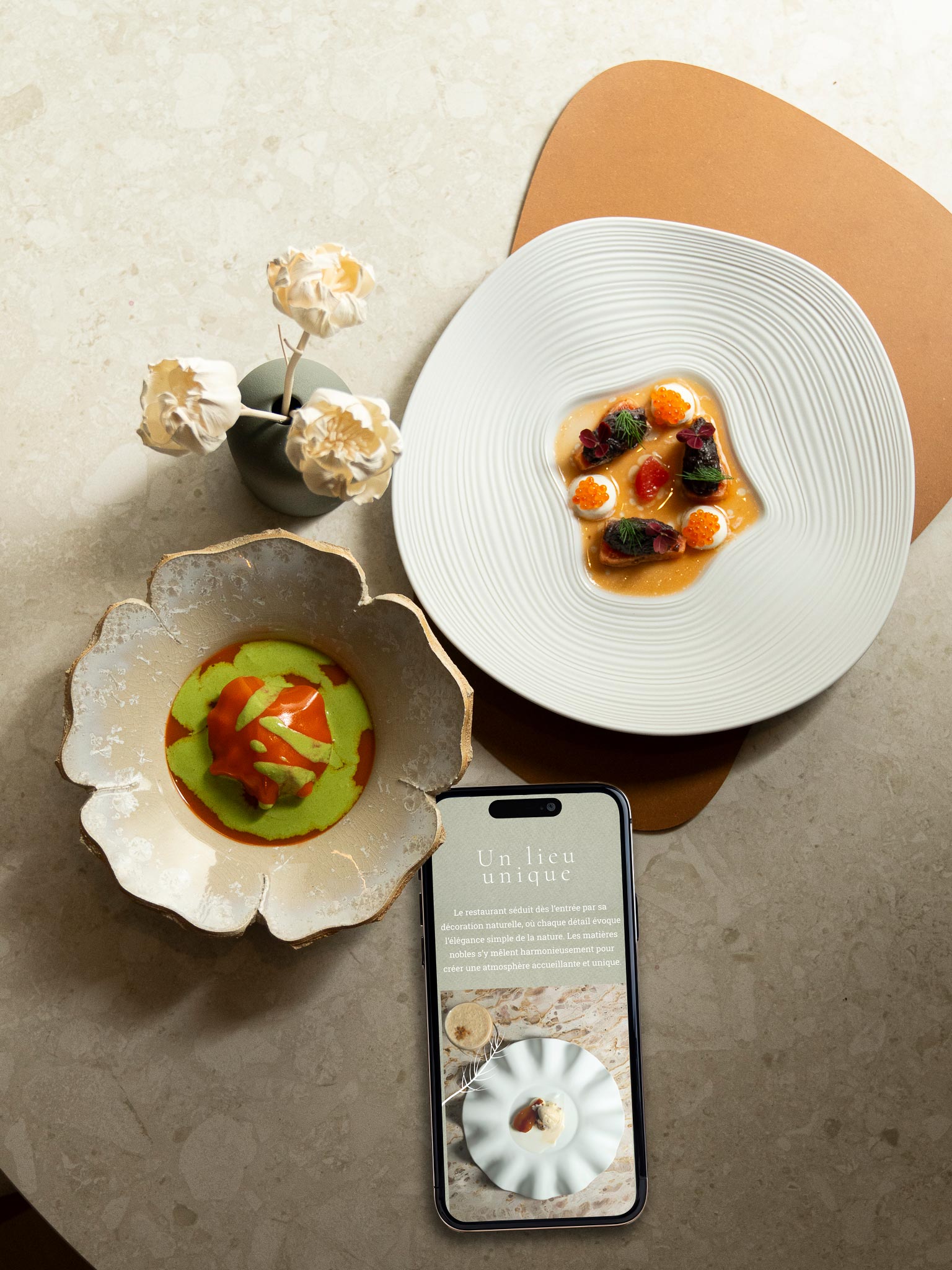 L’identité que j’ai développée s’inspire directement de cette philosophie : une esthétique élégante mais sans ostentation, des choix graphiques épurés, des tonalités naturelles et une harmonie globale évoquant à la fois la douceur, la précision et l’équilibre. Chaque élément visuel a été pensé pour refléter l’expérience proposée au restaurant : un moment suspendu, où la nature, la lumière et les matières dialoguent avec la gastronomie.